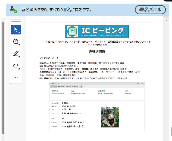 マイナンバーカードの電子証明書でPDFファイルに署名を書き込むことができます。