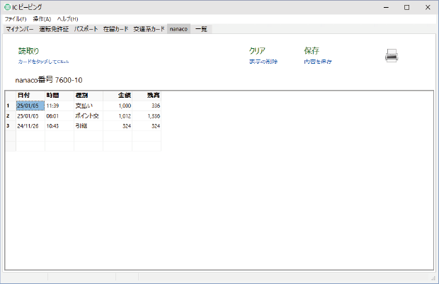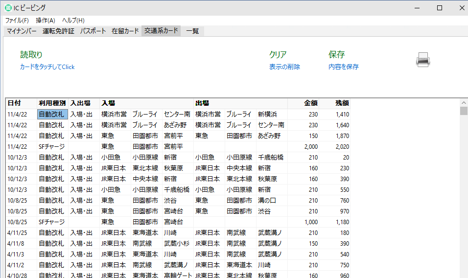 Suica,Pasmoなどの交通系のカードの読取りができます