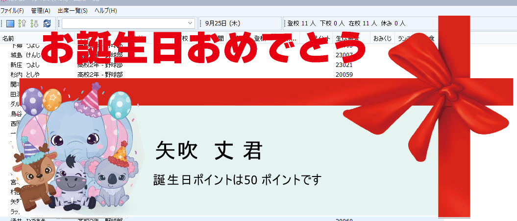合格時に次回の登校時におめでとうメッセージが表示されます。
