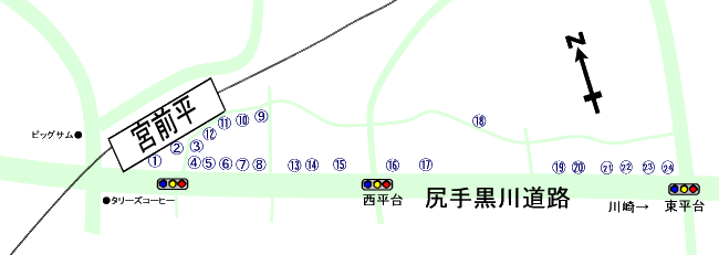 東平台交差点手前。東平台信号を左に曲がると宮崎台駅。