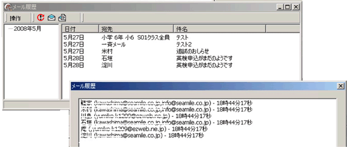 | 入退室メール以外のメール機能も充実! 保護者へのフォローも万全です! 個人宛のメールや、クラス単位の保護者宛メール、塾生全員の保護者宛メール、ポイント取得時のメールなどを送信できます。また、特定のメールについては、履歴も保存されます。 履歴は、送付先と内容がそれぞれ確認できます。 |