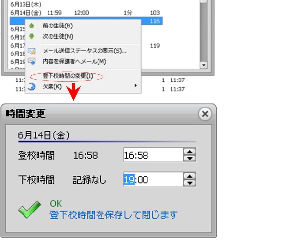 時間変更ダイアログが表示されます。修正したい登下校時間を入力し、OKをクリックしてください。